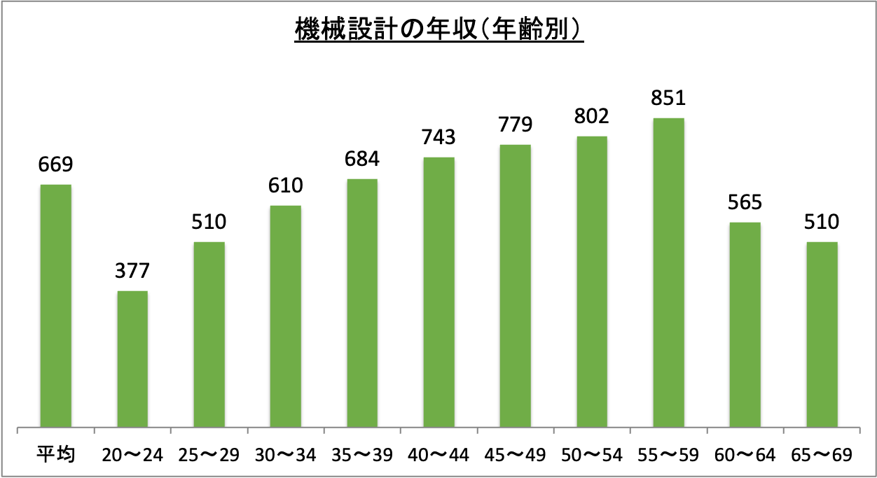 機械設計の年収を年齢別に見ると、年齢の上昇にしたがって、年収も上がっています。最も年収が高い世代は、55~59歳の851万円です。