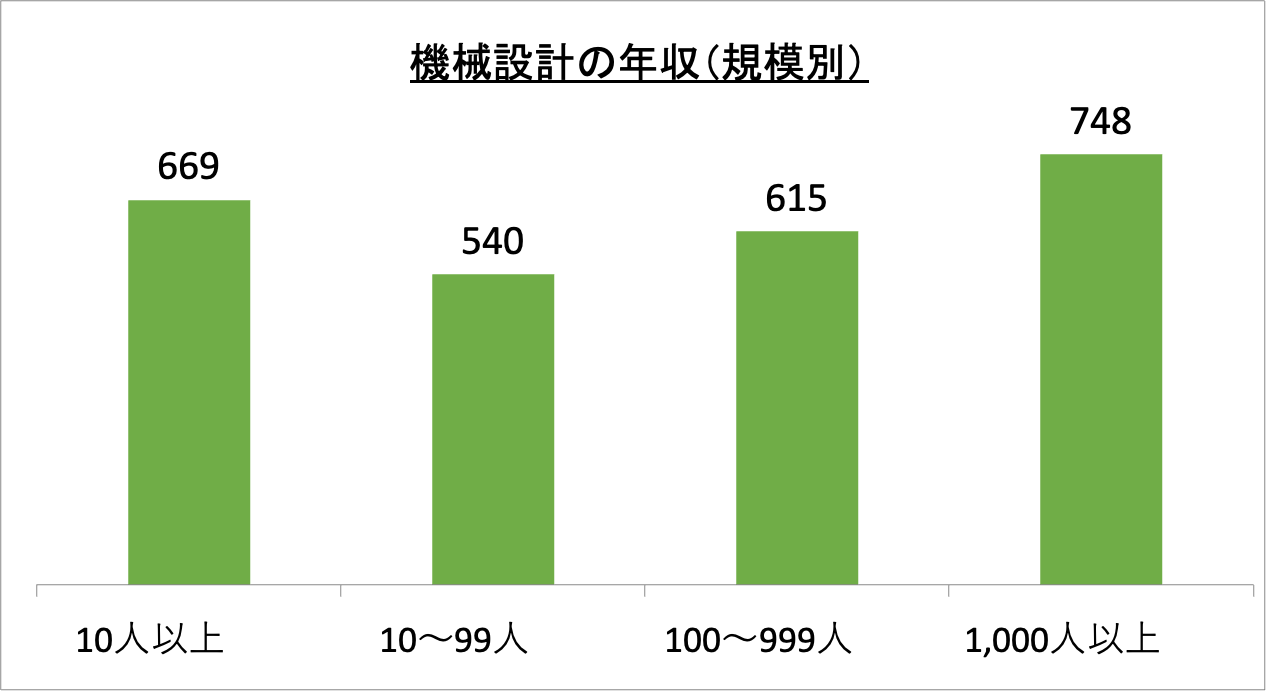 10〜99人規模の事業所に勤める機械設計の平均年収は540万円、100〜999人規模は615万円、1,000人以上の規模では748万円、10人以上規模の事業所平均は669万円となっています。